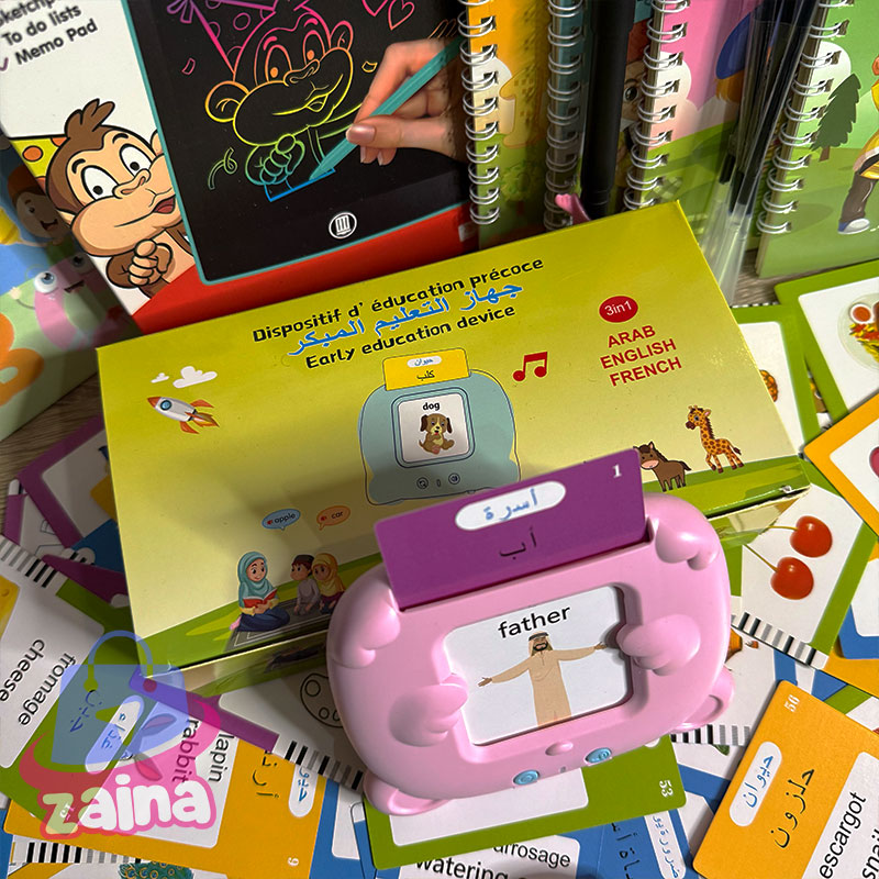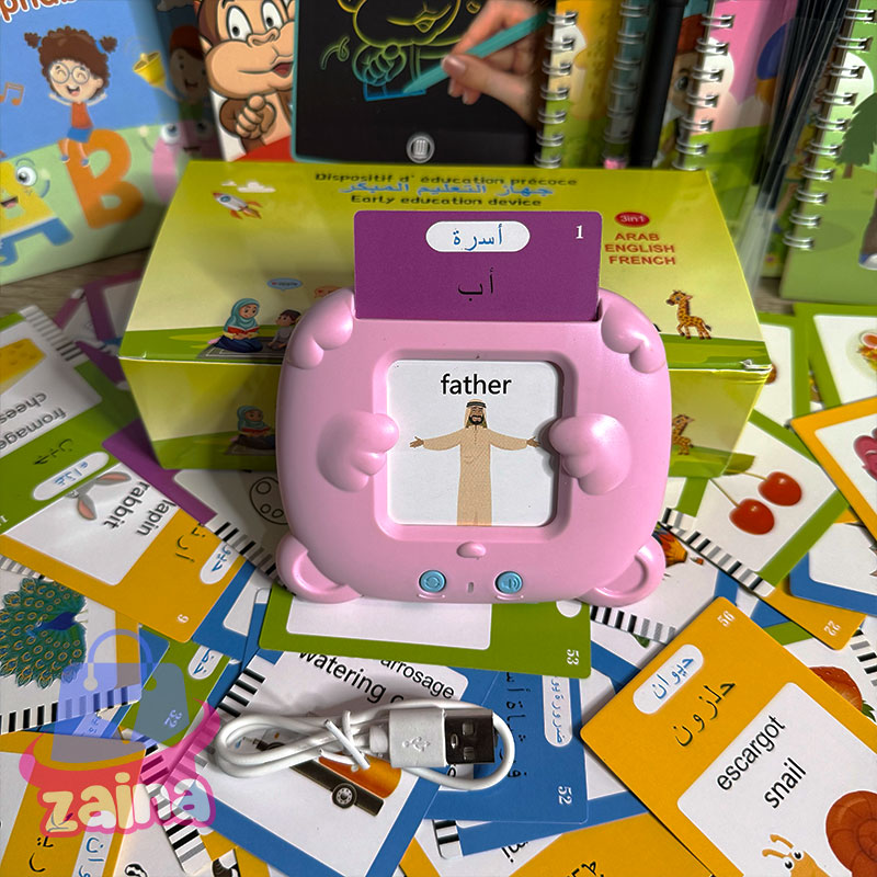 يحتوي على 112 بطاقة تعليمية ملوّنة تنطق الكلمات بثلاث لغات،