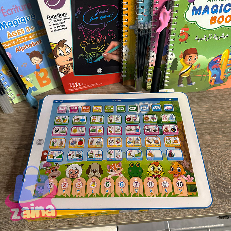 تابلت تفاعلي مصمّم خصيصًا لتعليم الأطفال الحروف، الأرقام، الألوان، وأسماء الحيوانات بطريقة مرحة وسهلة. يحتوي على أزرار ناطقة وصور توضيحية تحفّز التعلم البصري والسمعي، بالإضافة إلى أغاني وأناشيد تعليمية. 🎨 مناسب للأطفال، يساعد على تنمية المهارات اللغوية والحسية في بيئة تعليمية آمنة وممتعة